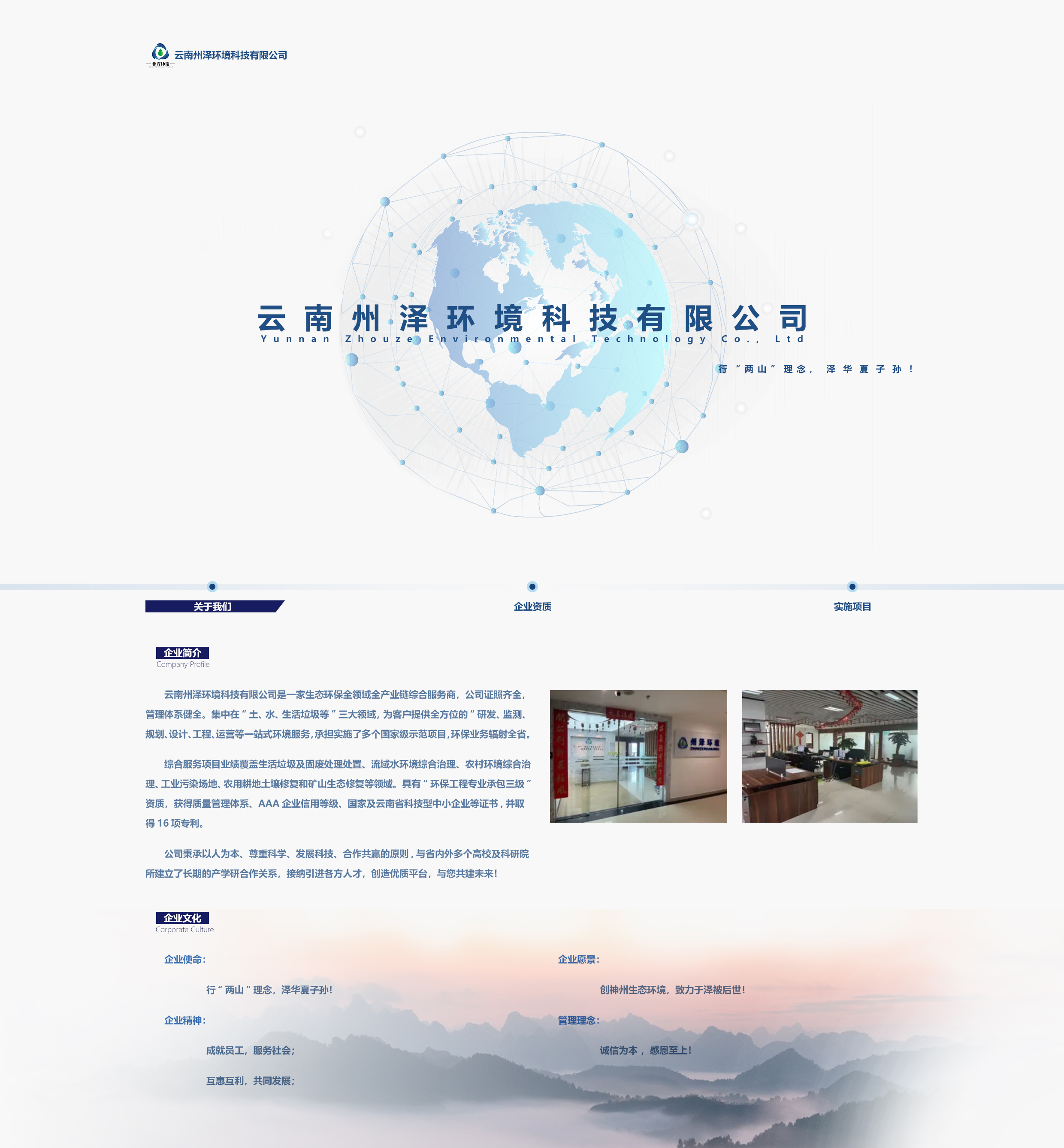 綜合服務(wù)項目業(yè)績覆蓋生活垃圾及固廢處理處置、流域水環(huán)境綜合治理、農(nóng)村環(huán)境綜合治理、工業(yè)污染場地、農(nóng)用耕地土壤修復(fù)和礦山生態(tài)修復(fù)等領(lǐng)域。具有“環(huán)保工程專業(yè)承包三級”資質(zhì),獲得質(zhì)量管理體系、AAA企業(yè)信用等級、國家及云南省科技型中小企業(yè)等證書,并取得16項專利。